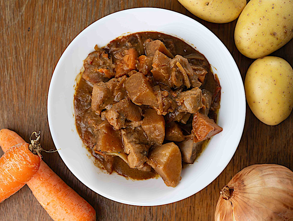 תבשיל פרגיות ברוטב של מחית מיסו בהירה וקרם קוקוס, עם תפוח אדמה בטטה ובצל.