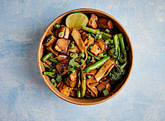 תבשיל תאילנדי עם טופו, קרם קוקוס, כפיר ליים, ובוטנים, מוגש עם אורז. המנה עם השפעות אינדונזיות.
