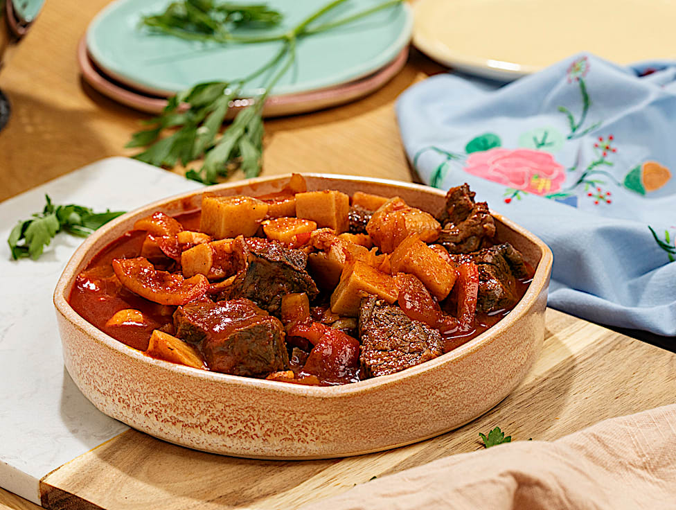 גולאש בקר עם פלפל אדום ותפוחי אדמה ברוטב עשיר - בשר בקר, פלפל אדום, בצל, תפוח אדמה, רסק עגבניות, מלח, פלפל שחור, פפריקה מתוקה, פפריקה חריפה, שמן קנולה