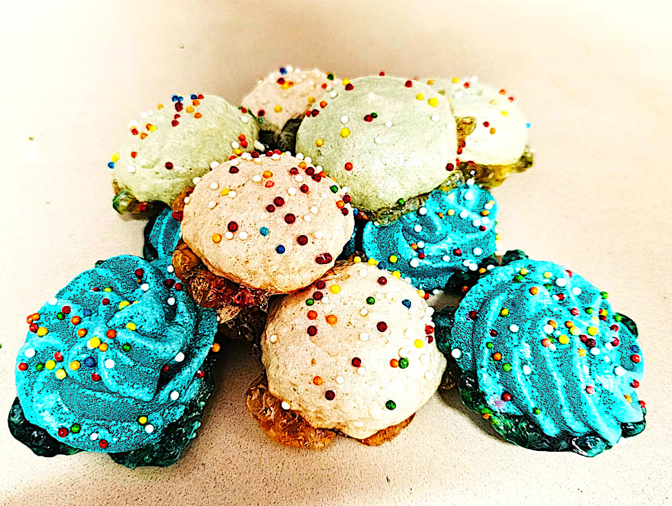 נשיקות צבעוניות מעוטרות בסוכריות צבעוניות אפויות בתנור בחום ואהבה.** לא מכיל גלוטן עד רמת התבלינים, כלים נקיים ואריזה נפרדת (הסביבה אינה סטרילית מגלוטן)