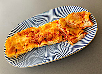 בצק עלים ביתי, פסטו, גבינה בולגרית, זיתים, ביצה, שומשום וממרח עגבניות