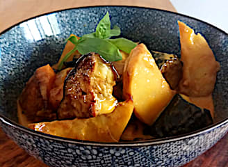 קציצות עוף אסייתיות משוגעות עם ג'ינג'ר טרי, בצל, כוסברה, שמן סומסום. מונחות ברוטב קרם קוקוס וקארי
