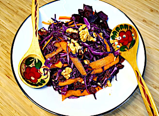 עדשים, בטטה, בזיליקום, בצל סגול, עגבניה, חמוציות, לימון, שמן זית