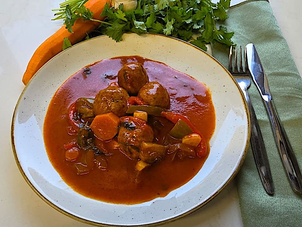 קציצות טבעוניות עשויות מחלבון אפונה ומוגשות עם רוטב אדום עשיר עם פלפלים, גזר, שום וכוסברה מנה מזינה ובריאה** לא מכיל גלוטן עד רמת התבלינים, כלים נקיים ואריזה נפרדת (הסביבה אינה סטרילית מגלוטן)