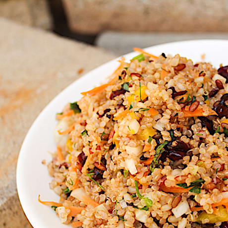 סלט קינואה עשיר עם ירקות קצוצים דק - בצל, מלפפון, גזר, ,פטרוזליה, שברי אגוזי מלך , חופן חמוציות - בתיבול לימון, שמן זית ומלח גס ויש לנו סלט שיכול להיות תוספת לכל ארוחה או כמנה עיקרית משביעה ובריאה לאוהבי הקינואה.