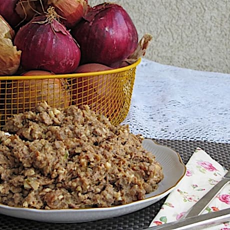 סלט תפוח אדמה עם רצועות בצל ופטרוזיליה טרייה, בתיבול עוקצני של חרדל ומיונז.