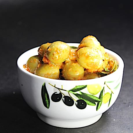 זיתים ירוקים במילוי גבינת לבנה ביתית, בכבישה של שמן זית, זעתר טרי, סומק, שטה וזעתר
